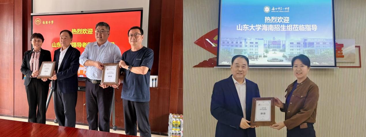 海南中学副校长贺航飞,海口市第一中学副校长汪剑春,海南华侨中学党委书记、副校长杨云义带队参加座谈研讨,共商拔尖创新人才培养新路径、新方法。陈向阳一行代表学校向海南中学颁发“山东大学生源贡献奖”“山东大学优秀本科新生培育奖”,向海口市第一中学颁发“山东大学生源贡献奖”。