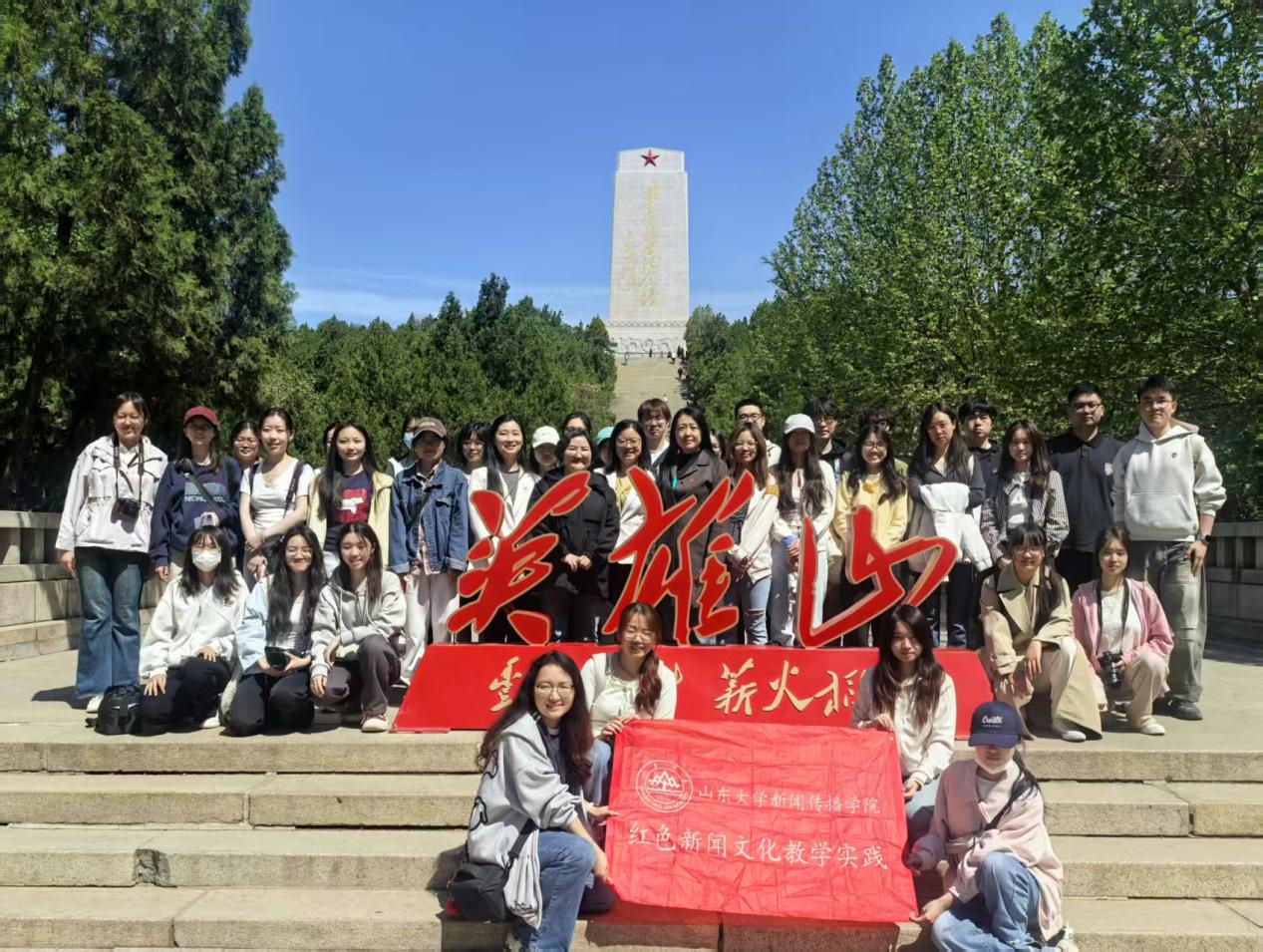 春和景明,松柏凝翠。4月12日上午,山东大学新闻传播学院“马克思主义新闻观实践课程:红色新闻文化教学实践”特色活动在济南战役纪念馆及英雄山革命烈士陵园举行。学院副院长、课程负责人邱凌教授带队,2024级新闻学专业本科生及师生党支部成员共同参与,在历史的现场触摸峥嵘岁月,在行走的课堂中传承红色基因,开展马克思主义新闻观教育、将课程思政和专业学习深度融合。上午9时,全体师生在济南战役纪念馆前集合并合影留念。邱凌向同学们介绍了此次课程的意义,将课堂搬进红色场馆,旨在让同学们在实地感悟中深化对马克思主义新闻观的理解,筑牢新时代新闻人的家国情怀与职业初心。