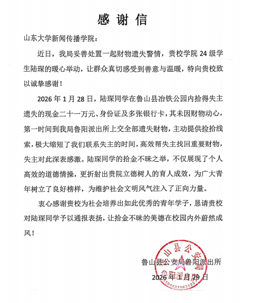 近日,新闻传播学院2024级本科生陆琛在河南省鲁山县冶铁公园拾得巨额遗失财物后,毫不犹豫上交警方的拾金不昧之举,受到鲁山县公安局鲁阳派出所致信感谢。陆琛的暖心行为不仅让失主感受到冬日里的善意与温暖,更彰显了山大学子的良好道德风貌和学院立德树人的育人成果。