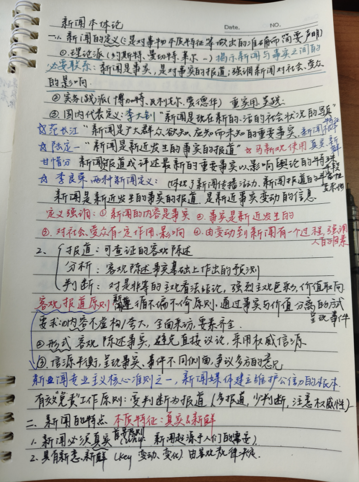 杨小丽的笔记围绕着新闻学概论、外国新闻事业史、新闻传播大讲堂展开,梳理了新闻、宣传等相关知识点。这份笔记最特别的地方在于用清晰的板块组织内容,重点内容用红笔标注。这种方法可以非常清晰地看到核心内容,读起来既流畅又不失条理,便于快速定位重点