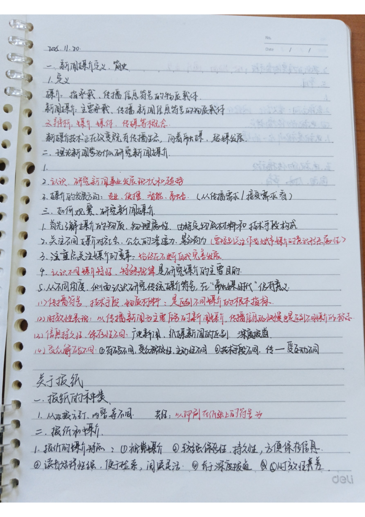 刘宸宇同学的笔记内容详实、条理清晰。笔记中涵盖的历史背景、关键人物与法规节点,显示出其对新闻传播史的系统把握;而对模拟信号、A/D转换等技术要点的记录,也反映出他对数字媒体技术基础的扎实掌握。