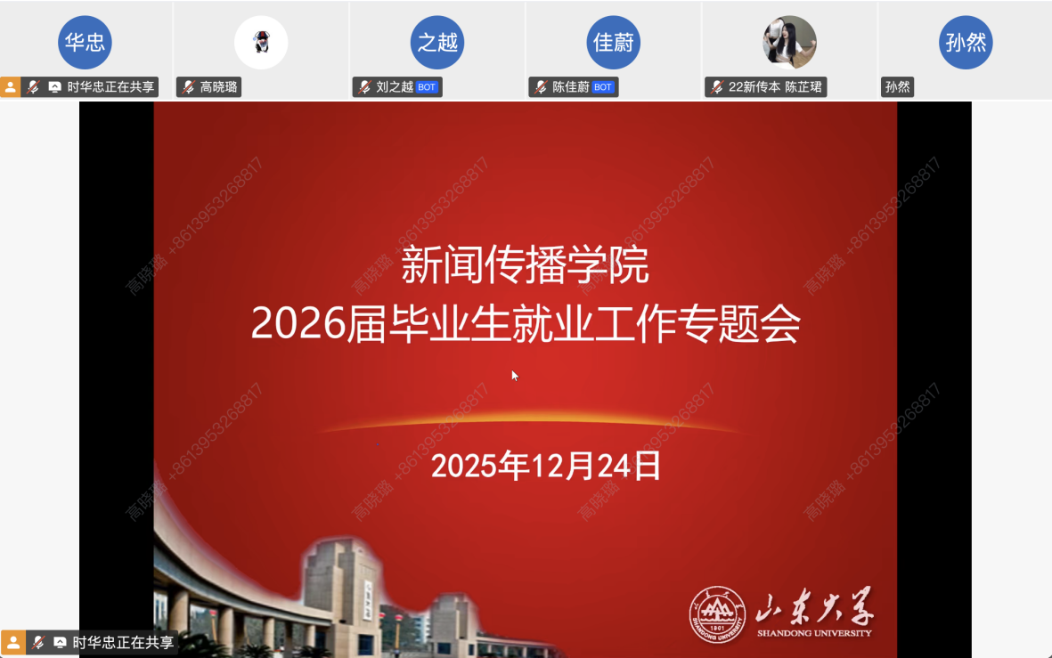 为深入贯彻党的二十届四中全会关于就业工作的战略部署,准确把握“十五五”时期高校毕业生就业工作的新形势与新要求,扎实推进2026届毕业生就业指导与服务工作,12月24日上午,新闻传播学院召开2026届毕业生就业工作专题会。研究生毕业班辅导员王丽君参加会议,会议由本科生毕业班辅导员时华忠主持,全体2026届本科生与研究生参加会议。