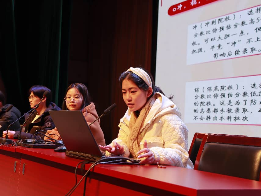 宣讲团的队员们分板块展开核心内容分享,在招生培养板块中,队员介绍了山东大学作为教育部直属重点综合性大学、世界一流大学建设高校的办学底蕴,重点讲解“一校三地”办学格局、学科综合优势和全国重点实验室建设成果,还围绕“六堂一院”拔尖人才培养体系、宽口径转专业政策、跨学科复合培养项目进行介绍,展现出山大“人人皆可拔尖,个个均能创新”的育人理念。招生政策板块,队员系统梳理普通类、强基计划、综合评价等各类招生渠道,着重澄清济南、青岛与威海校区毕业证学位证完全一致的关键信息,还针对学生关注的强基计划,介绍“3+1+X”本硕博衔接培养模式与动态调整机制。在备考经验分享环节,队员结合自身高考经历,针对高二学科难度上升的特点,提出“建立框架、内化知识”的学习策略,从目标管理、错题整理、时间分配等方面分享实操方法,强调定期重做错题、考前复盘以及备考与健康管理平衡的重要性。志愿填报建议板块,队员借助“冲、稳、保、垫”四阶策略,演示依据全省位次筛选院校、精简表格、利用志愿填报软件辅助决策的方法,同时提醒学生研究学校官网、了解重点学科、接受全部填报专业等关键环节。