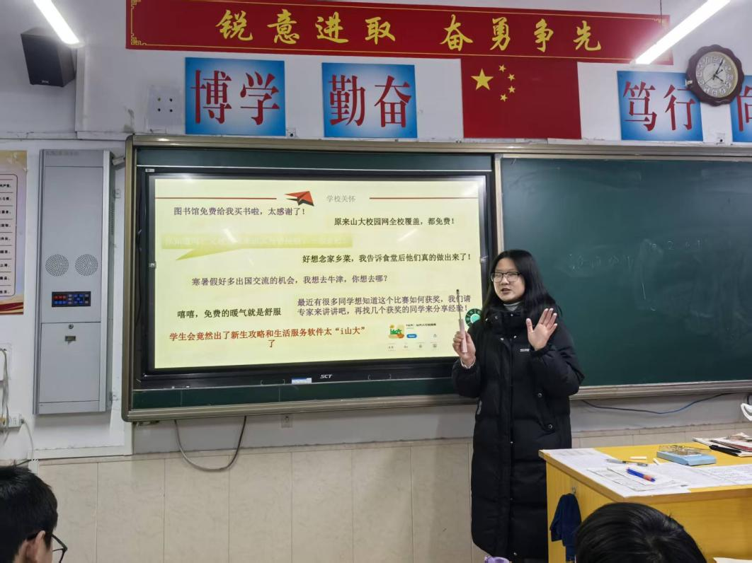 在邢台市南和区第一中学,实践队队员结合校方需求,将宣讲重点聚焦于高中生升学规划与心态调节,面向高二学生开展专项分享,并与班主任老师密切配合,为学生提前做好升学规划引导。宣讲中,队员针对学生普遍感兴趣的“高中阶段心态平衡方法、考入山东大学的多元途径”两大核心问题展开详细讲解,结合自身备考与升学经历,分享心态调节的实用技巧,同时系统解读山东大学强基计划、综合评价、普通高考等各类招生途径的报考要求与备考要点,为高二学生提前规划升学路径提供专业指导。在校方班主任老师协助下,实践队向学生发放准备的山大文创礼物,深受学生喜爱。