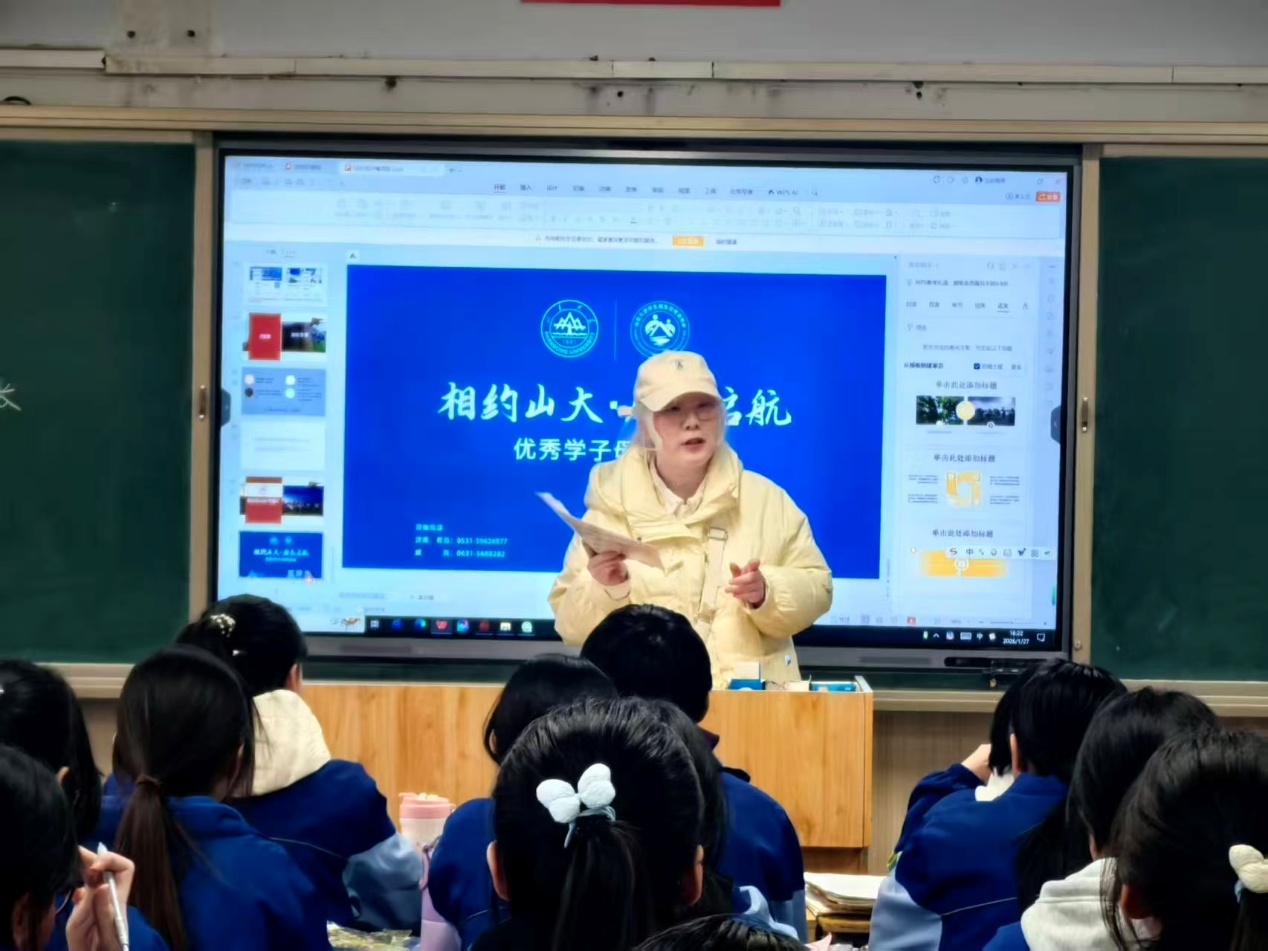在河北省沙河市第二中学的宣讲活动中,实践队单名队员独立完成宣讲任务,精准覆盖学校历史方向、物理方向各一个班级,累计面向近百名学生开展分享。沙河市第二中学为全民制高级中学,是邢台市首批经河北省教育厅认定的河北省示范性高级中学,办学底蕴深厚,学生升学需求明确。活动筹备阶段,实践队将山大校史、学科优势、招生政策、校园生活等内容进行系统化梳理,确保宣讲内容贴合高中生认知特点。宣讲现场,队员打破单向讲解模式,创新设置互动问答环节,鼓励学生主动提出感兴趣的问题,再结合问题针对性讲解核心内容,实现宣讲与提问深度结合。同时,队员在互动间隙为学生分发山东大学宣传物资,充分调动学生参与积极性,现场学生提问踊跃、互动热烈,对山东大学的各类信息展现出浓厚兴趣。此次宣讲活动也获得了沙河二中校方教师的高度认可。