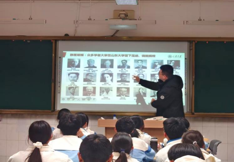 宣讲现场,彭宇轩首先介绍了在山大留下足迹的学者,向同学们展现了山东大学深厚的学术底蕴与人文传承。从文学巨匠到科学泰斗,一代代学者在山大的校园里深耕不辍,积淀学术土壤,也让同学们深刻体悟到了“学无止境,气有浩然”这句校训的内涵。接着,他紧密围绕“百年山大,育贤图强”的主题,结合翔实的数据,系统介绍了山大从本科到博士后的完整人才培养体系,让同学们直观感受到山大雄厚的学科实力与深厚的育人底蕴。他还提醒同学们提前明确学业目标,合理规划学科优势,为未来报考做好准备。