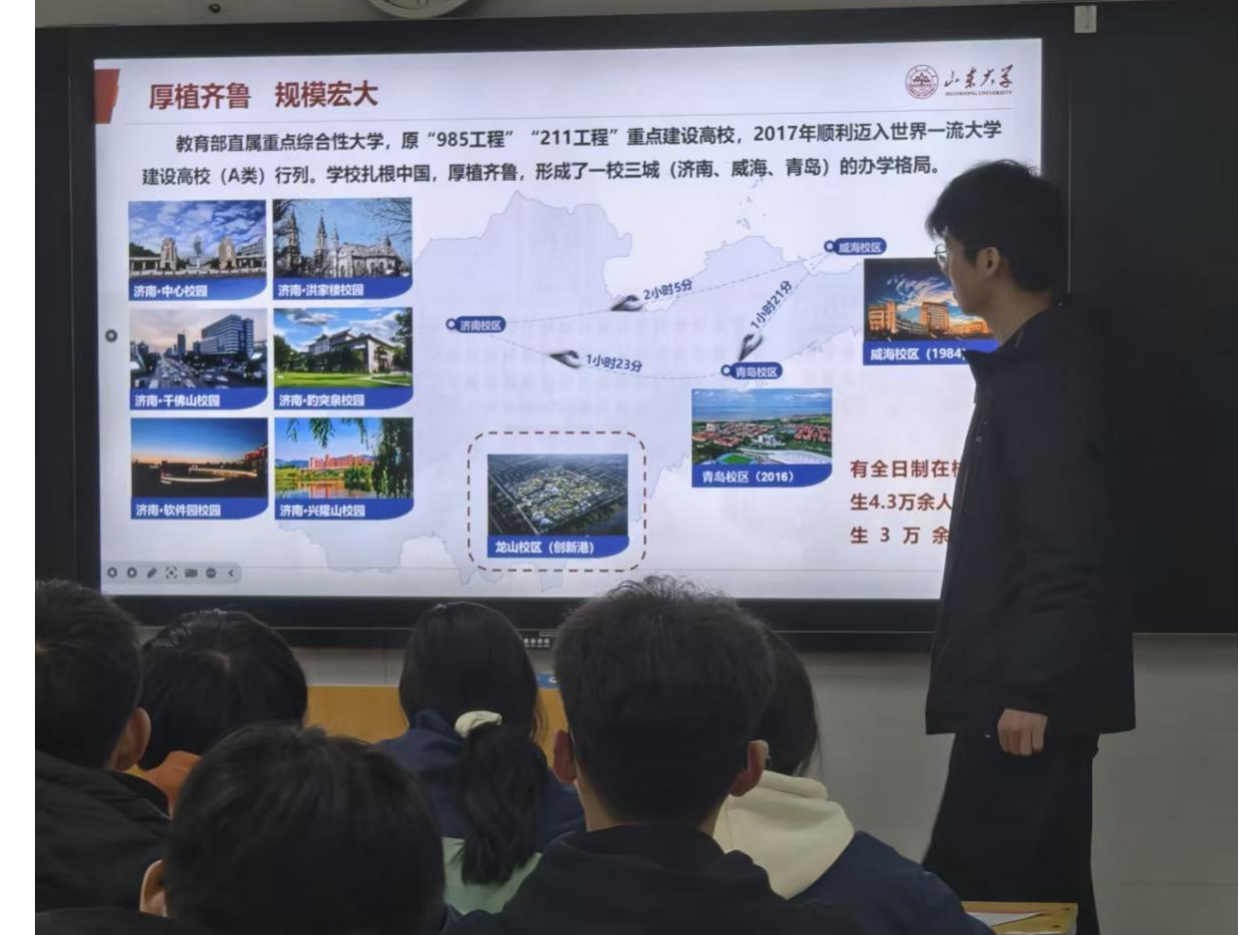 随后,邵子隆同学围绕“百廿山大,浩然育贤”主题,通过精美的PPT展示了山东大学在文史、医学、理工等领域的传统优势与创新成就。他重点介绍了泰山学堂、尼山学堂、齐鲁医学堂等拔尖人才培养平台的建设成效,并结合图片与数据,生动呈现了学校在科学研究、国际交流、校园服务等方面的举措。当屏幕上出现中心校区体育馆、图书馆、教学楼等标志性建筑,以及青岛校区滨海校园的美丽风光时,同学们眼中闪烁着向往的光芒。