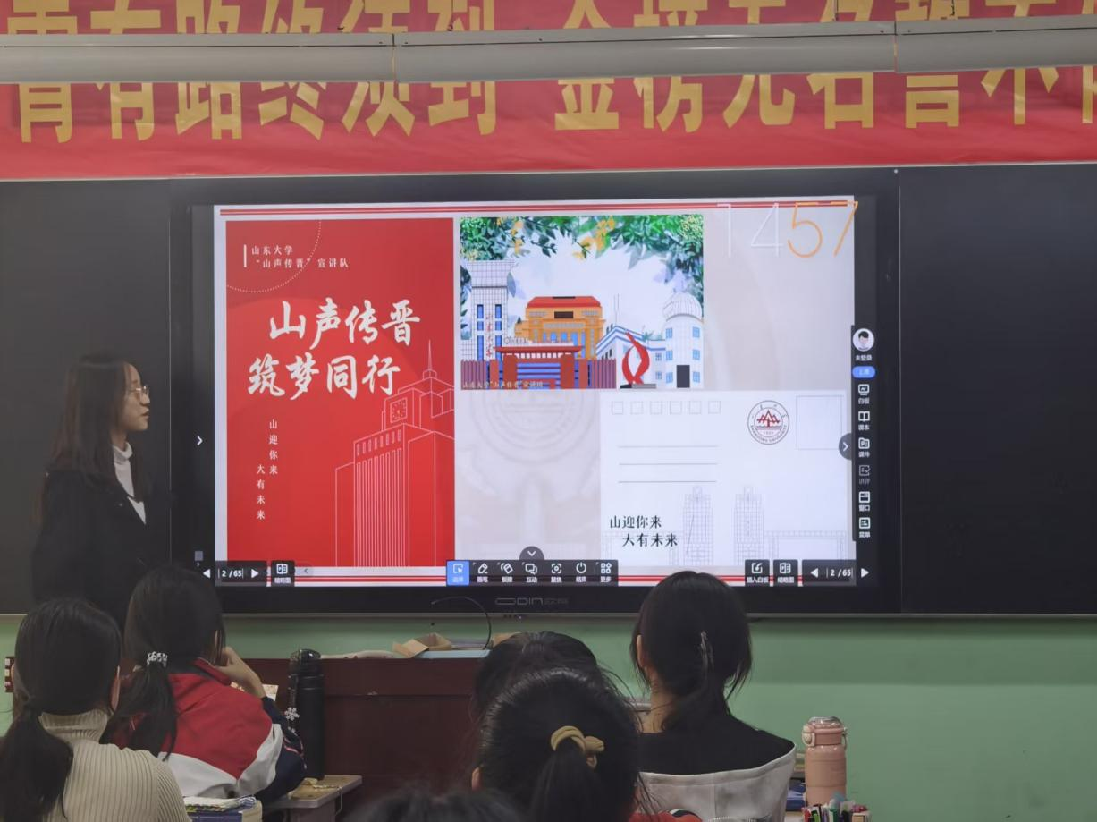 宣讲伊始,队员们首先展示了自行制作的宣传物料,并播放了宣传先导片,激起高三学子们对于山大的浓厚兴趣。闫紫璇同学详细准确地介绍了山东大学的历史与优势,展现了山大过去的深厚底蕴与优良传统、当代的宏大规模和雄厚实力。随后又对山大的教学与资源进行介绍,让同学们对山大的基本情况、培养模式、师资力量、资助与奖励政策有一定的了解,全方位展现出山大的优势,吸引同学们报考山大。