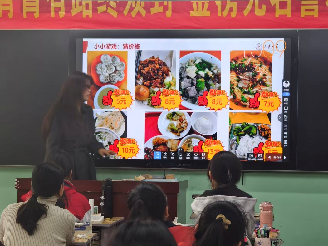 随后,赵若苓同学对山大的校园生活进行分享,用自己拍摄的校园照片让同学们了解山大美丽的校园风景与丰富的校园生活,并通过“猜食堂菜品价格”的互动小游戏让宣讲氛围轻松活跃,调动了同学们的热情。同时,她还采用表格与框架形式,对山大招生政策进行了解读,让同学们轻松了解“怎样上山大”。