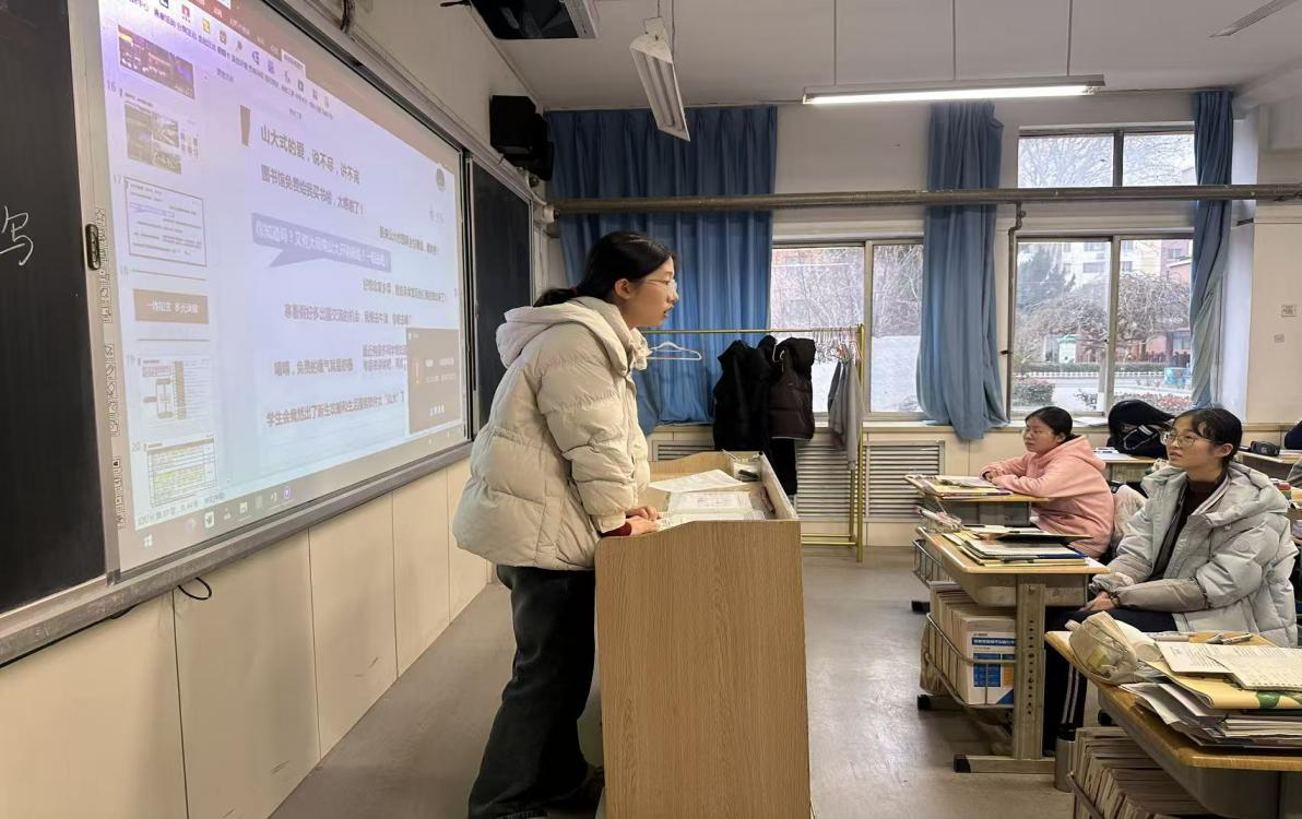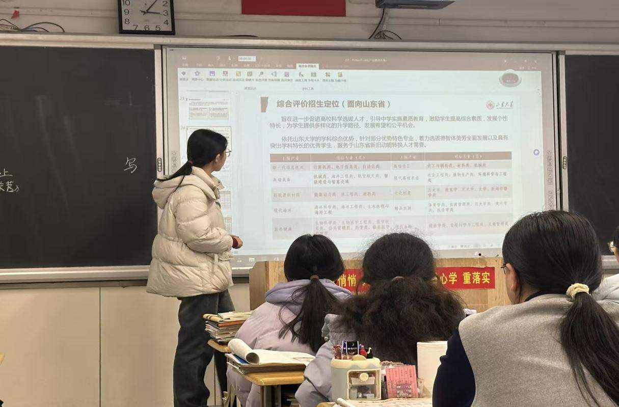基于前期的充分准备,2月26日下午,薛雅蕾作为主讲人,面向高三二班学生展开了一场内容丰富的主题宣讲。本次宣讲以“相约山大·励志启航”为主题,从校史底蕴、一校三地办学格局、优势学科、校园生活、人才培养与招生政策等多个层面,全面展现山东大学的独特魅力与深厚实力。从百廿学府的文脉传承,到文史哲、数理化、临床医学等一流学科的蓬勃发展;从泰山学堂、尼山学堂、齐鲁医学堂等拔尖创新人才培养平台,到完善多元的奖助体系与丰富向上的校园文化,宣讲成员用鲜活的校园故事与真实的成长经历,将山大的学术高度、人文温度与发展广度一一呈现,让在场学子真切感受到百年学府的气度与担当,在心中种下奔赴理想、逐梦山大的种子。