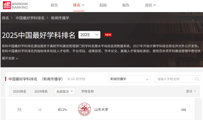 升位跨层:山东大学新闻传播学首次进入软科中国最好学科前12% 2025年10月15日,高等教育专业评价机构上海软科正式发布2025软科中国最好学科排名,山东大学新闻传播学位列第14名,较2024年名次上升一位,首次进入软科中国最好学科——新闻传播学前12%,标志着山东大学新闻传播学科建设在提质增效上实现重要突破。山东大学多年来深耕新闻传播学科建设,坚持内涵发展。2016年独立建院以来,学科在师资队伍、人才培养、科研成果、平台建设、国际化等方面逐年突破,2021-2023年连续三年斩获4项国...